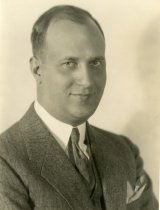 Black and white photograph measuring 6.5" x 8.5" depicting R. Otis McClintock, president, First National Bank & Trust Company. Label attached to back provides subject's name and company, photographer's name and studio handwritten on back. |
