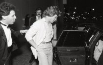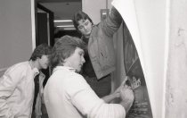 Black & white, 35 mm, roll film negative containing two images taken during the theater premiere of the 1983 motion picture "The Outsiders," held on March 22 in Tulsa, OK. The film was based on the 1967 novel by Tulsa author S. E. Hinton and released as a motion picture on March 25, 1983. The first two images show actor Patrick Swayze autographing a film poster. The third image shows Swayze entering a limousine. |